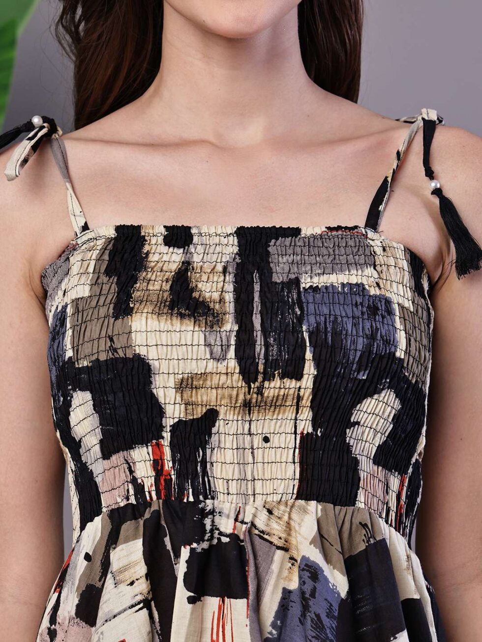 Effortlessly stylish dress with a vibrant abstract print, tie-up shoulder straps, and a chic high-low handkerchief hemline ? perfect for casual days or evening gatherings.